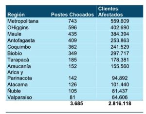 Le sigue la región de O´Higgins, con 402.690 clientes afectados; Maule con 384.394; Biobío con 297.717; Antofagasta con 253.863 y Coquimbo con 241.529 clientes afectados en su suministro por postes chocados. Más atrás se ubican Arica y Parinacota, Tarapacá, Atacama, Valparaíso, Ñuble y Araucanía (ver tabla).