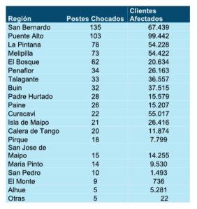 Por cantidad de clientes afectados con las interrupciones de suministro producto de los postes chocados, la región que lidera las estadísticas en la zona de concesión de CGE es la Metropolitana, con 743 postes y 559.609 clientes sin servicio durante el 2025.